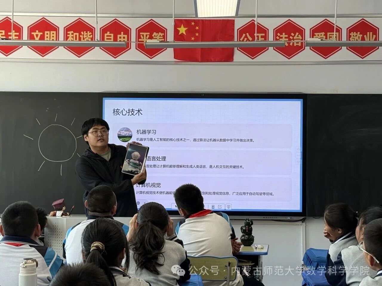 在和林格尔县乳业开发区第一小学,内蒙古科学技术普及学会兼职副秘书长、球速体育平台博士研究生乌日乐等一群研究生科普志愿者,他们用所学的“数据科学与智能信息处理”“基础数学”“应用数学”等学科专业,用通俗易懂的语言,为小学生普及“人工智能是什么”“人工智能会做什么”“机器是怎样看懂图像的”,通过活动让学生积极体验,在活动中感知科技、思考未来、收获新知。