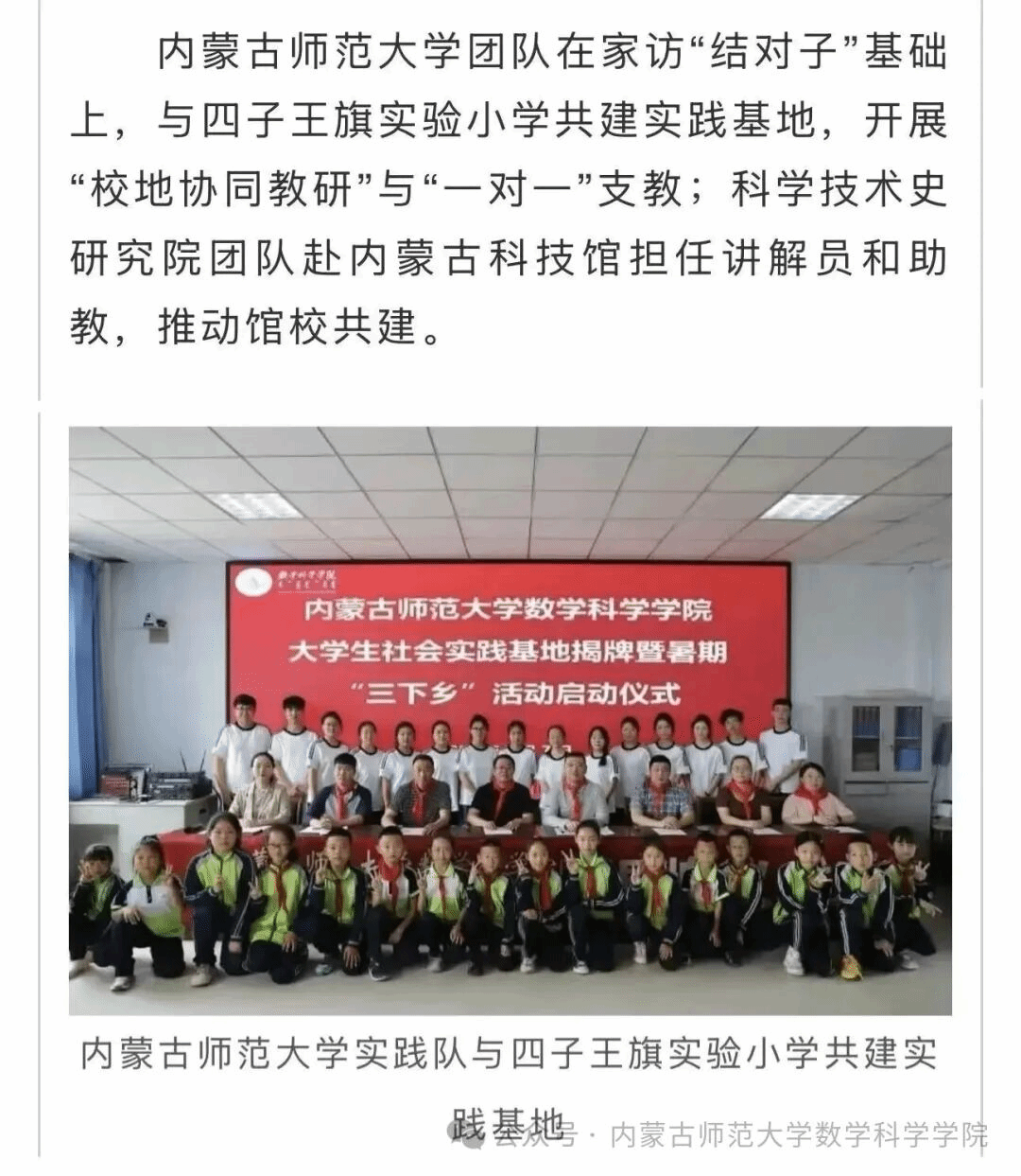 9月17日,内蒙古教育厅发布了“青春聚力两大件事”系列报道,主题为“在守护北疆安全中彰显青年的使命与担当”,球速体育平台三下乡实践队与四子王旗实验小学共建实践基地的活动也被纳入其中。