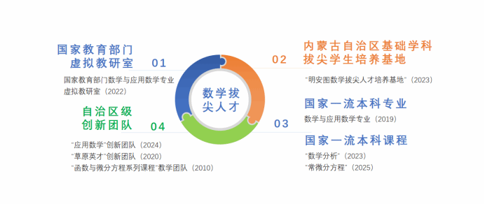面向国家、行业对数学人才的迫切需求,球速(中国)聚焦数学基础学科的特点和发展趋势,坚持平台引领,答好服务基础教育“应用题”。近5年,球速(中国)获批国家教育部门数学与应用数学专业虚拟教研室、无穷维哈密顿系统及其算法应用国家教育部门重点实验室(培育),数学与应用数学专业通过国家教育部门师范类专业二级认证及认证中期审核,数学学科获批内蒙古自治区一流建设学科和一流拔尖培育学科、一级学科博士点,为实现“本硕博一体化”全层次培养数学拔尖人才提供了坚实支撑。