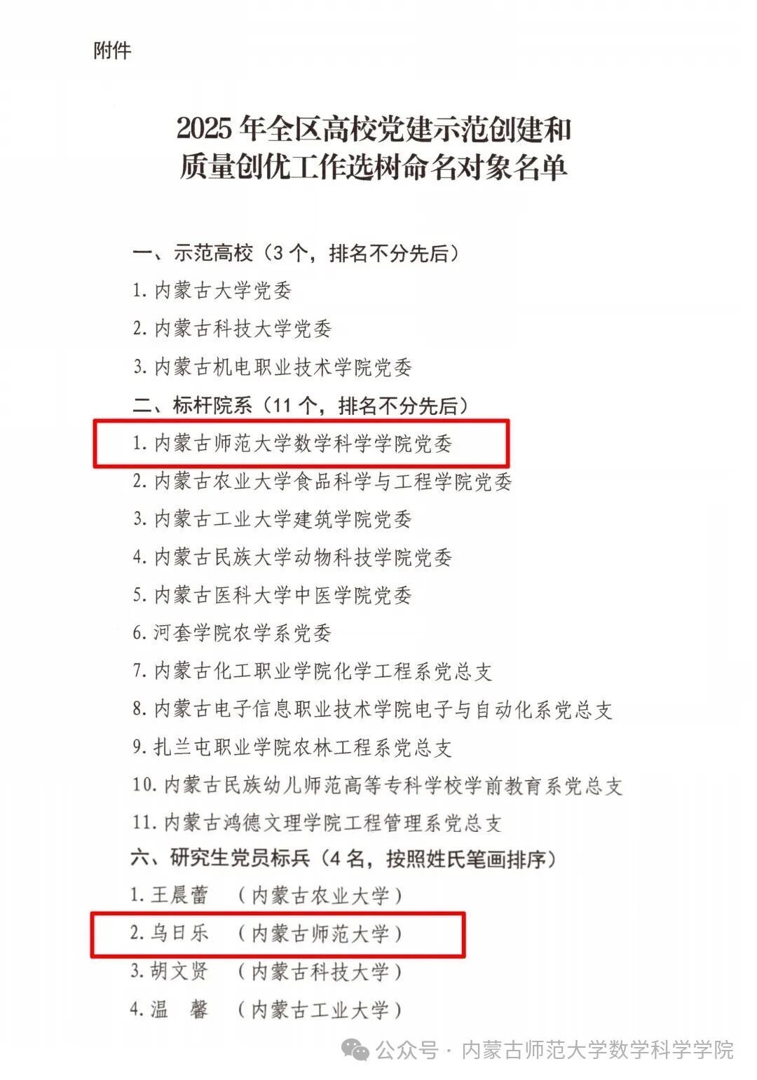近日,自治区党委教育工委公布了2025年全区高校党建示范创建和质量创优工作拟选树命名对象,球速体育平台党委成功入选“全区高校党建标杆院系”,球速体育平台博士研究生乌日乐荣获“全区高校研究生党员标兵”荣誉称号。